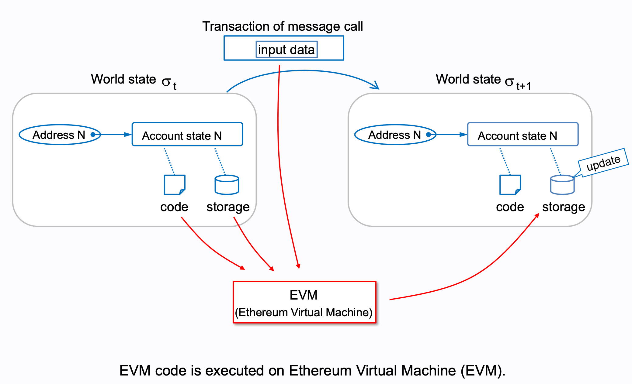 EVM은 트랜잭션 안에 들어오는 컨트랙트 즉 바이트 코드를 해석/실행하여 storage를 업데이트합니다.