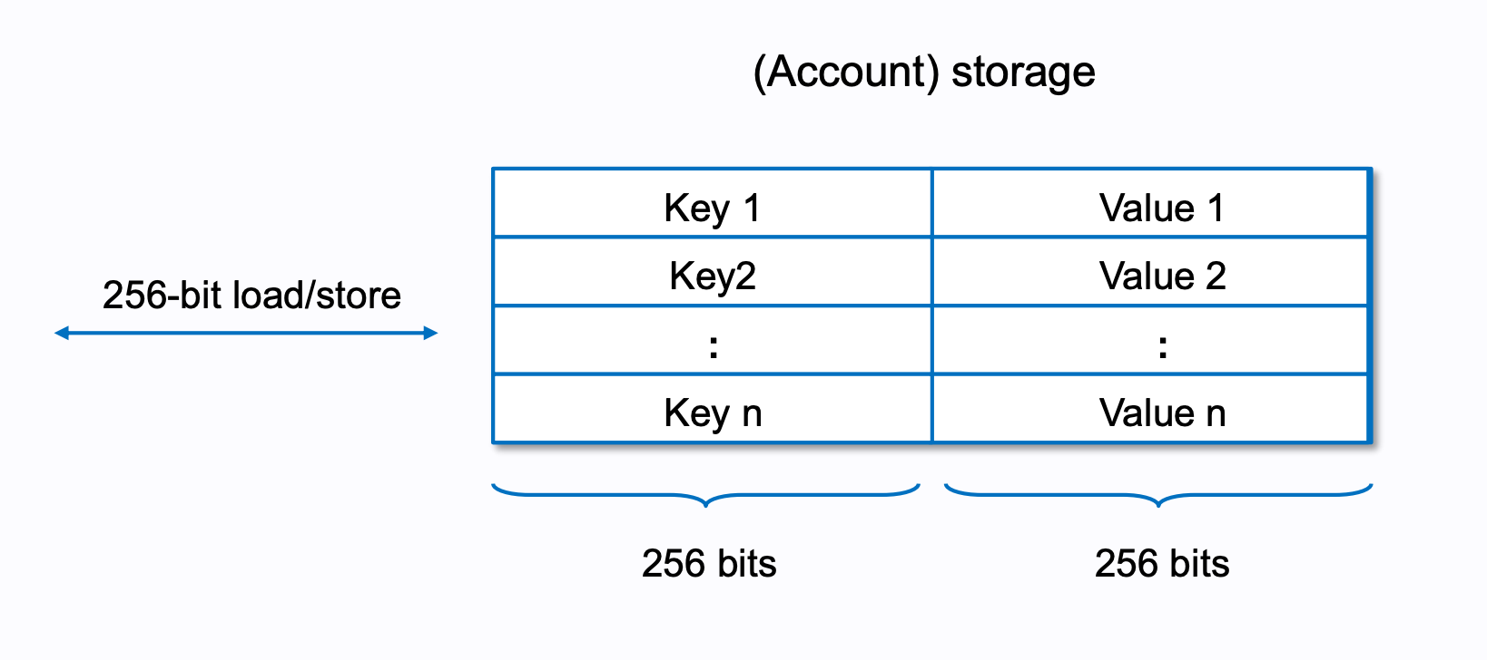 스토리지는 256비트 단어를 256비트 단어로 매핑하는 키-값 저장소입니다.