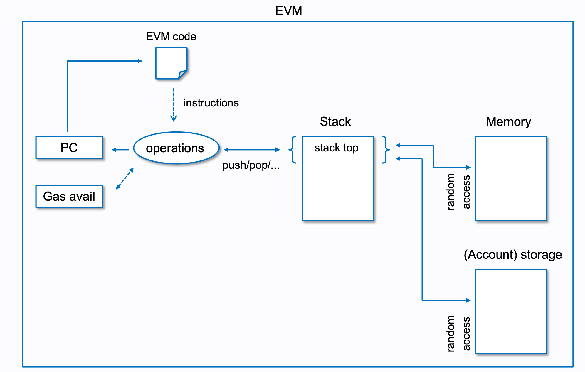 EVM은 스마트 컨트랙트의 바이트코드를 네트워크 모든 노드가 똑같이 해석/실행할 수 있는 표준화된 환경을 제공하며, 여타 다른 VM과 같이 스택과 임시 데이터를 저장하는 메모리, 스토리지를 분리해 효율성과 확장성을 챙겼습니다.